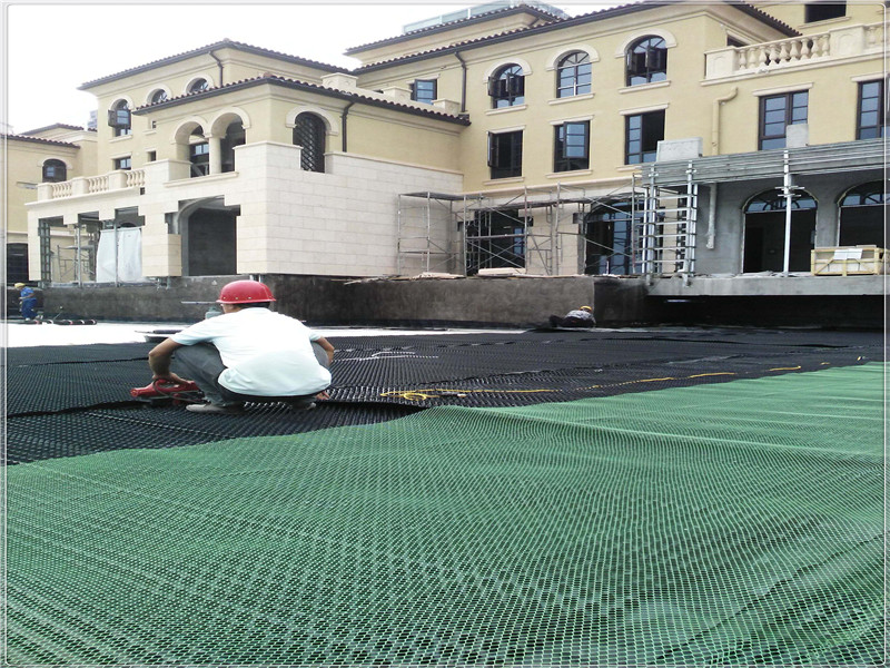 利用工藝壓型在土工膜上壓出封閉突起的圓臺狀、柱狀、球冠狀殼體,形成的一種膜、殼連續,具有立體空間和一定支撐剛度。結合表面鋪貼的無紡土工布濾水層。構架出架空層,利用架空層形成排水、排氣通道,同樣利用架空層達到隔音、隔振的功能。
