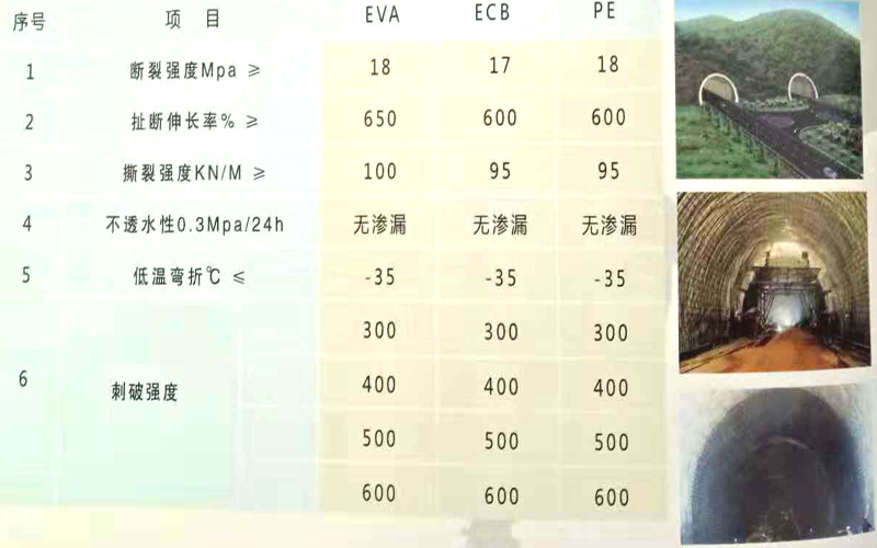 防水板又叫土工膜,習(xí)慣上把>=0.8mm厚的土工膜叫防水板,<0.8mm的叫土工膜,它是以高分子聚合物為基本原料制成的一種防滲材料,分為均質(zhì)防水板和復(fù)合防水板。吊掛式隧道專用防水板是我公司開發(fā)創(chuàng)新的新型隧道專用防水材料,實現(xiàn)無穿通釘施工懸吊排一次完成,可大大簡化傳統(tǒng)防水材料在隧道中的施工難度,提高鋪設(shè)質(zhì)量和鋪設(shè)效率,縮短工期,大幅降低工程綜合造價,具有極強的市場競爭優(yōu)勢。